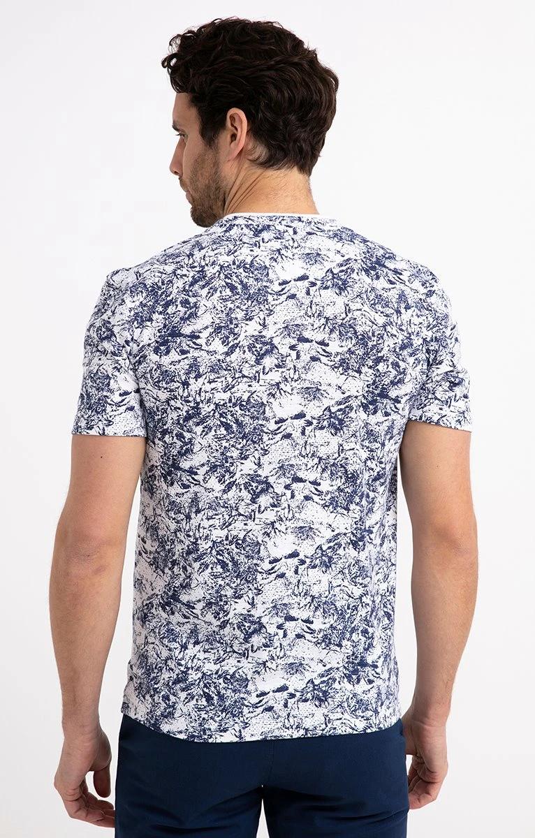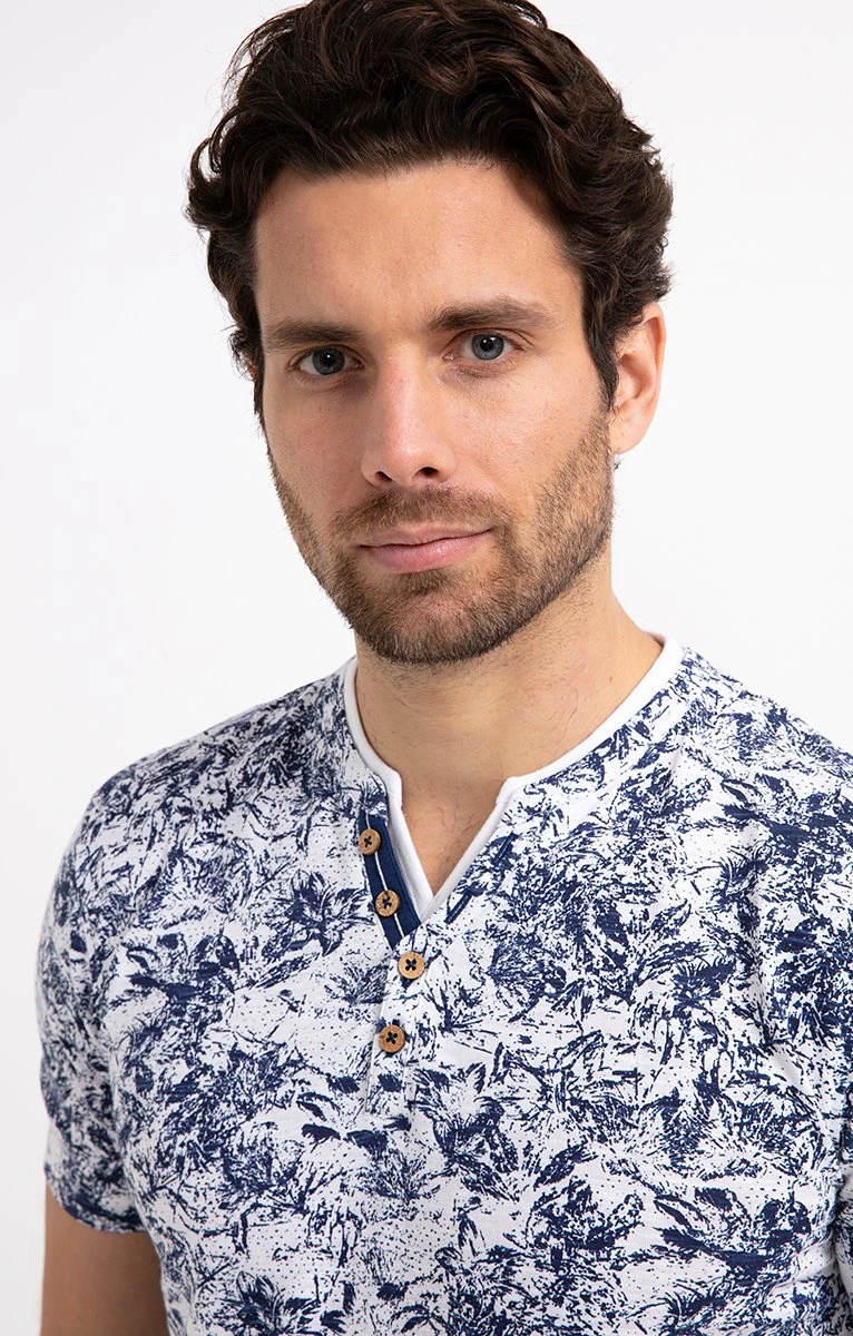 T-shirt imprimé à manches courtes et col tunisien de qualité écoresponsable. Coupe droite. Longueur hanches. Manches courtes sur emmanchures droites. Double col tunisien effet superposition, 4 petits boutons décoratifs en coco. Motifs végétaux une couleur imprimés sur l’ensemble. Ourlets aux manches et à la base. Composition en coton et polyester recyclé. Notre mannequin Joffrey mesure 1m88 et porte un t-shirt taille M.