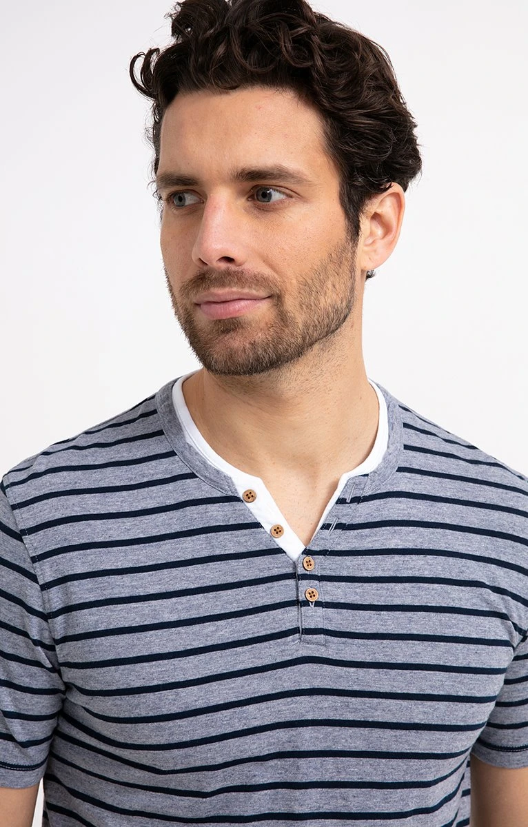 T-shirt à manches courtes chiné et rayures marinières effet superposition. Coupe ajustée. Longueur hanches. Manches courtes sur emmanchures droites. Col tunisien double, 4 petits boutons, effet superposition. Rayures horizontales contrastantes sur l’ensemble. Jersey chiné. Manches et base ourlées. Composition 100% coton. Notre mannequin Joffrey mesure 1m88 et porte un t-shirt taille M.