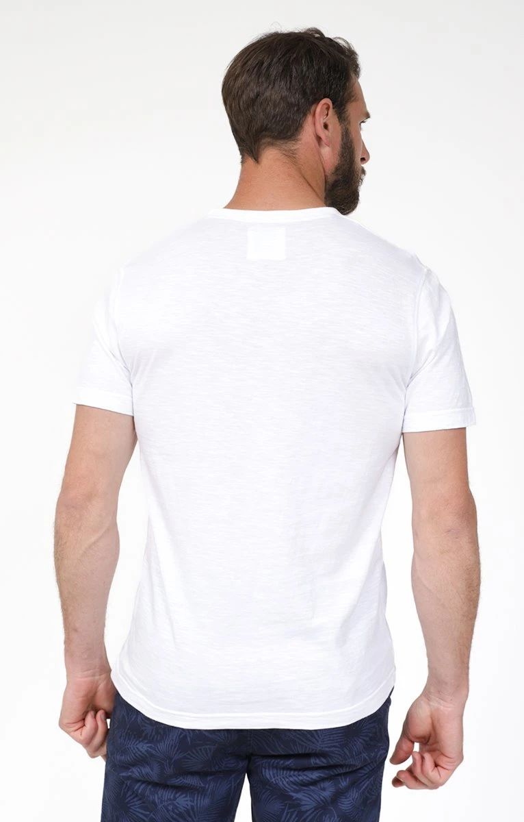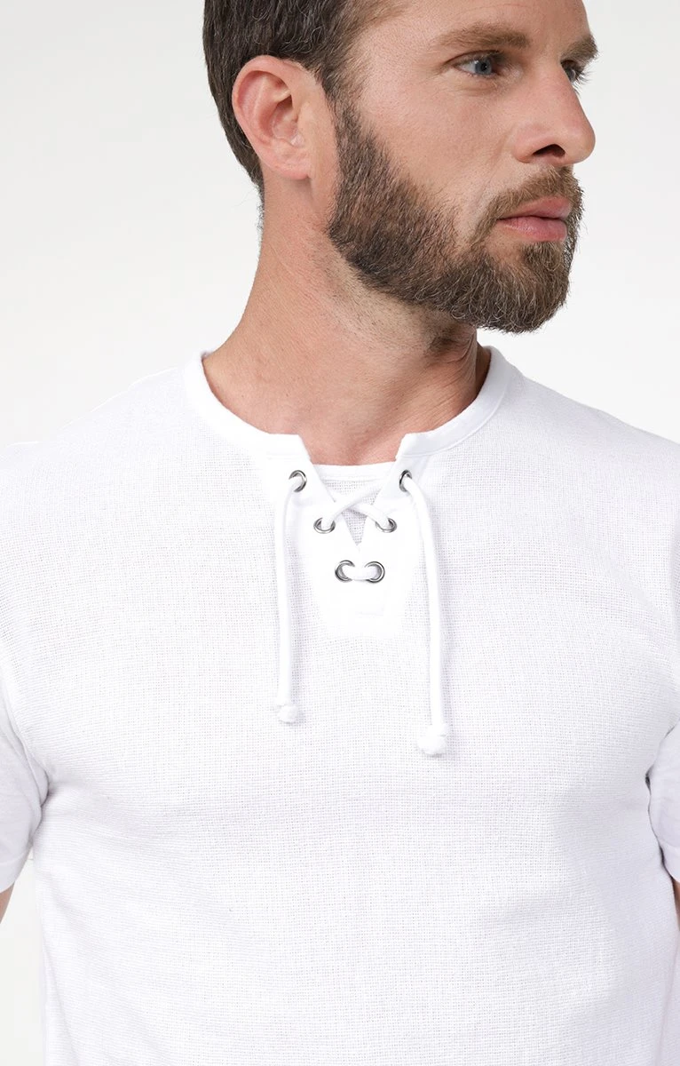 T-shirt avec col lacé. Coupe ajustée. Manches courtes. Col en V avec laçage et doublure unie. Coloris uni. Lacet uni cordelette. Œillets en métal argenté. Coutures discrètes ton sur ton. Composition 100% coton. Ce t-shirt décontracté est idéal pour accompagner un jean regular et des boots en cuir lisse. Notre mannequin Nicolas mesure 1m87 et porte un t-shirt taille M.