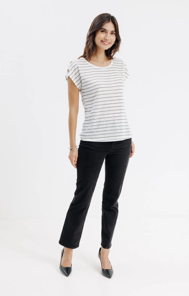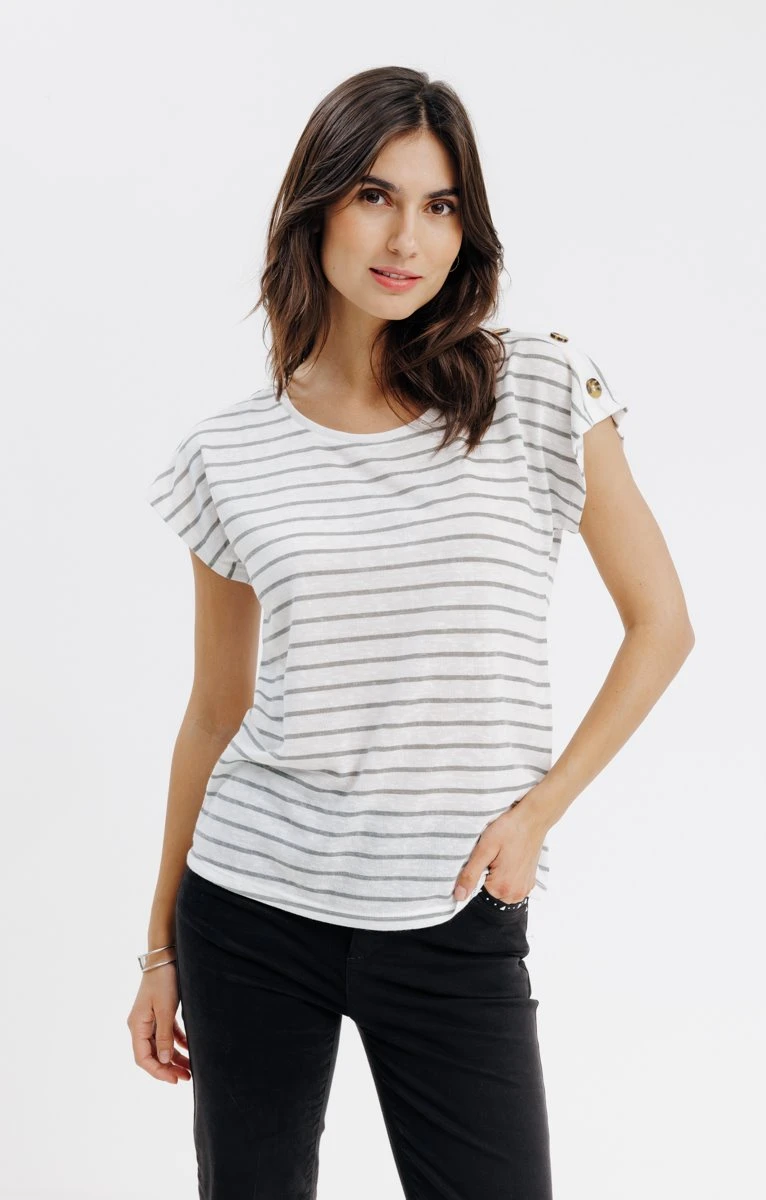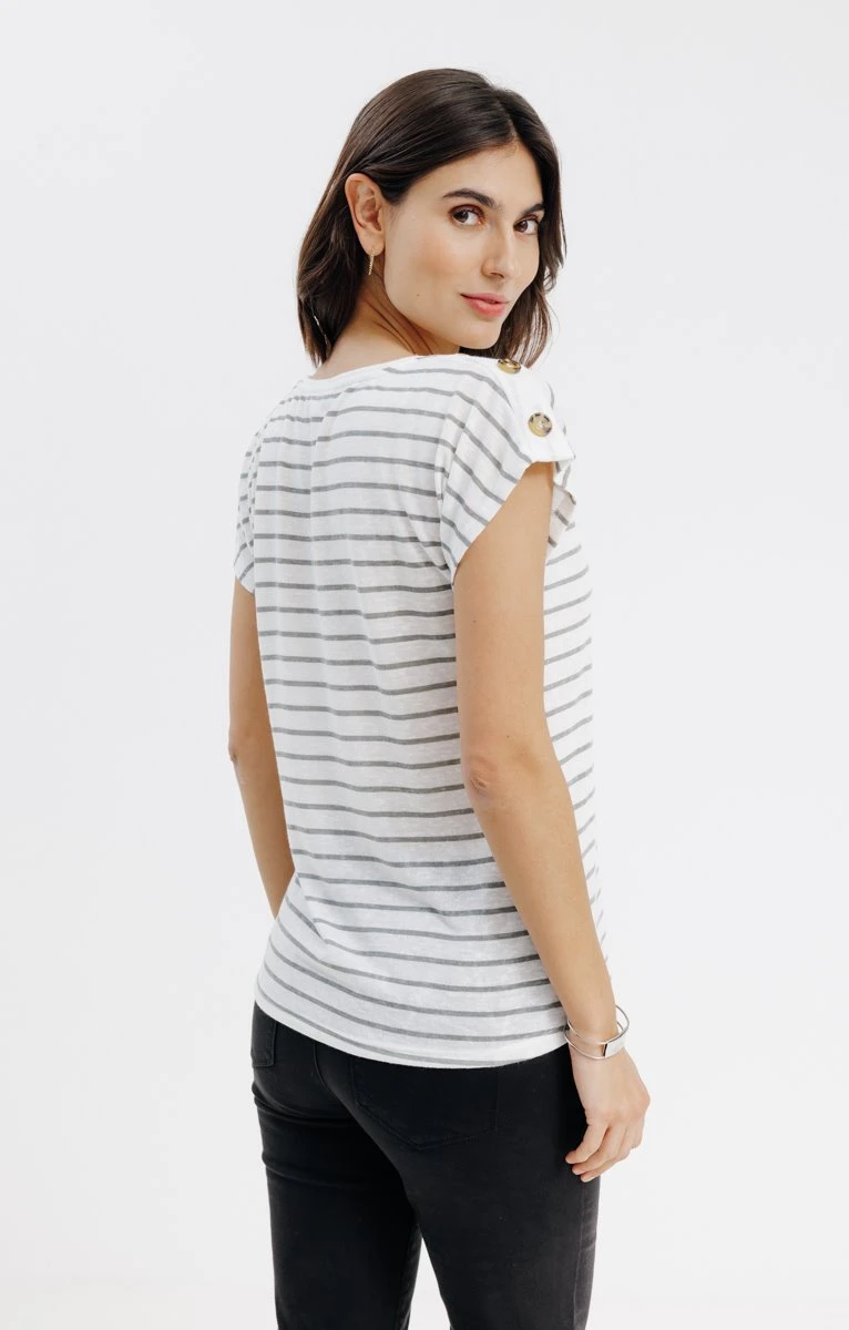 T-shirt rayé à manches courtes et col rond avec boutons sur l’épaule. Coupe droite. Manches courtes légèrement amples, effet papillon. Col rond. T-shirt à rayures. Modèle en maille fine souple. Empiècement uni et 3 gros boutons contrastants façon écaille sur la ligne d’épaule. Base droite. Notre mannequin Laura mesure 1m78 et porte un t-shirt taille 1.