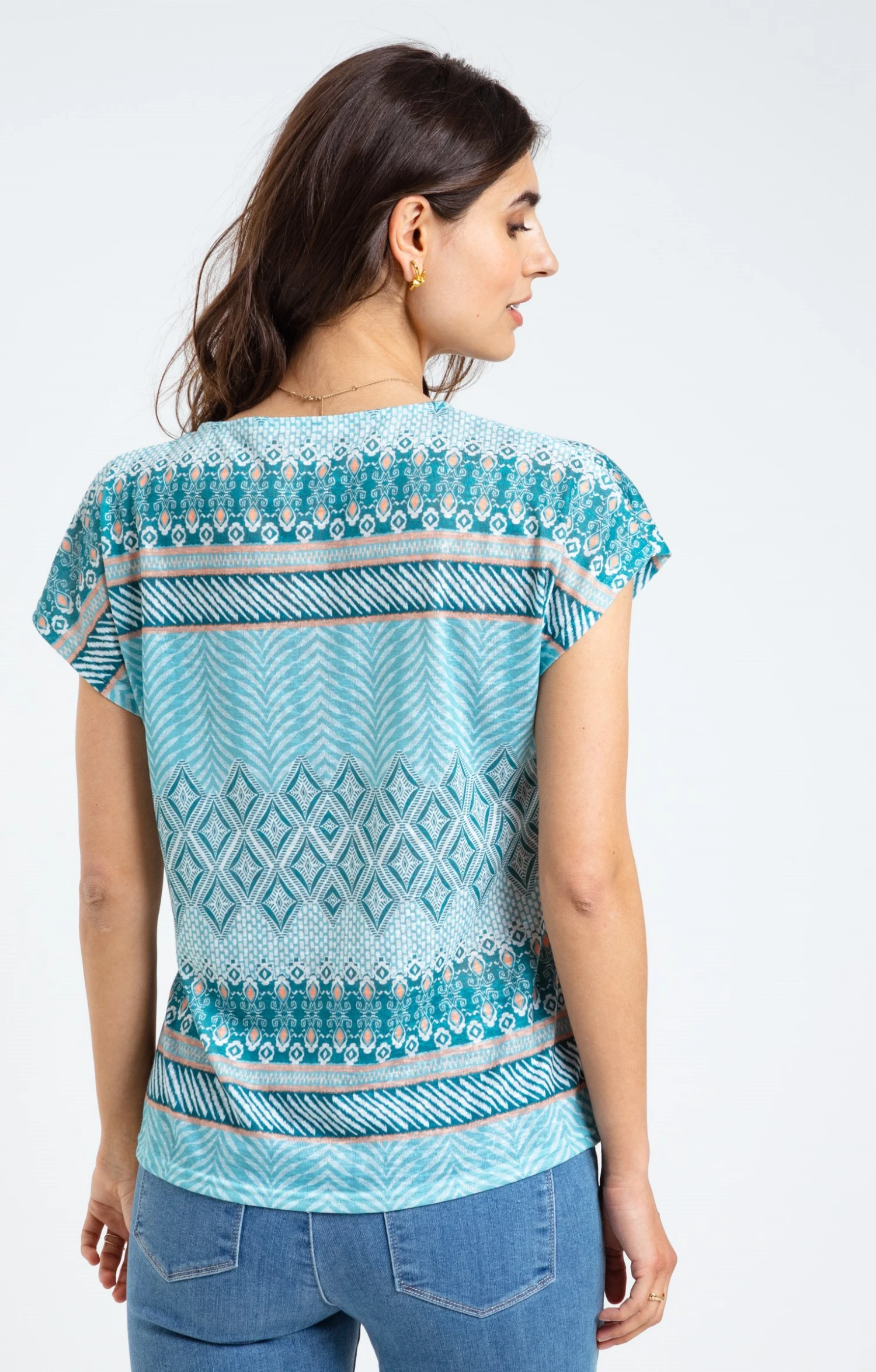 T-shirt oversize imprimé mosaïque multicolore à col rond et manches courtes. Coupe oversize. Manches courtes en T. Col rond évasé. Imprimé multicolore, motifs géométriques variés disposés en bandes horizontales. Tissu fin et fluide. Finitions ourlées au niveau du col, des manches et à la base. Notre mannequin Laura mesure 1m78 et porte un t-shirt taille 1.