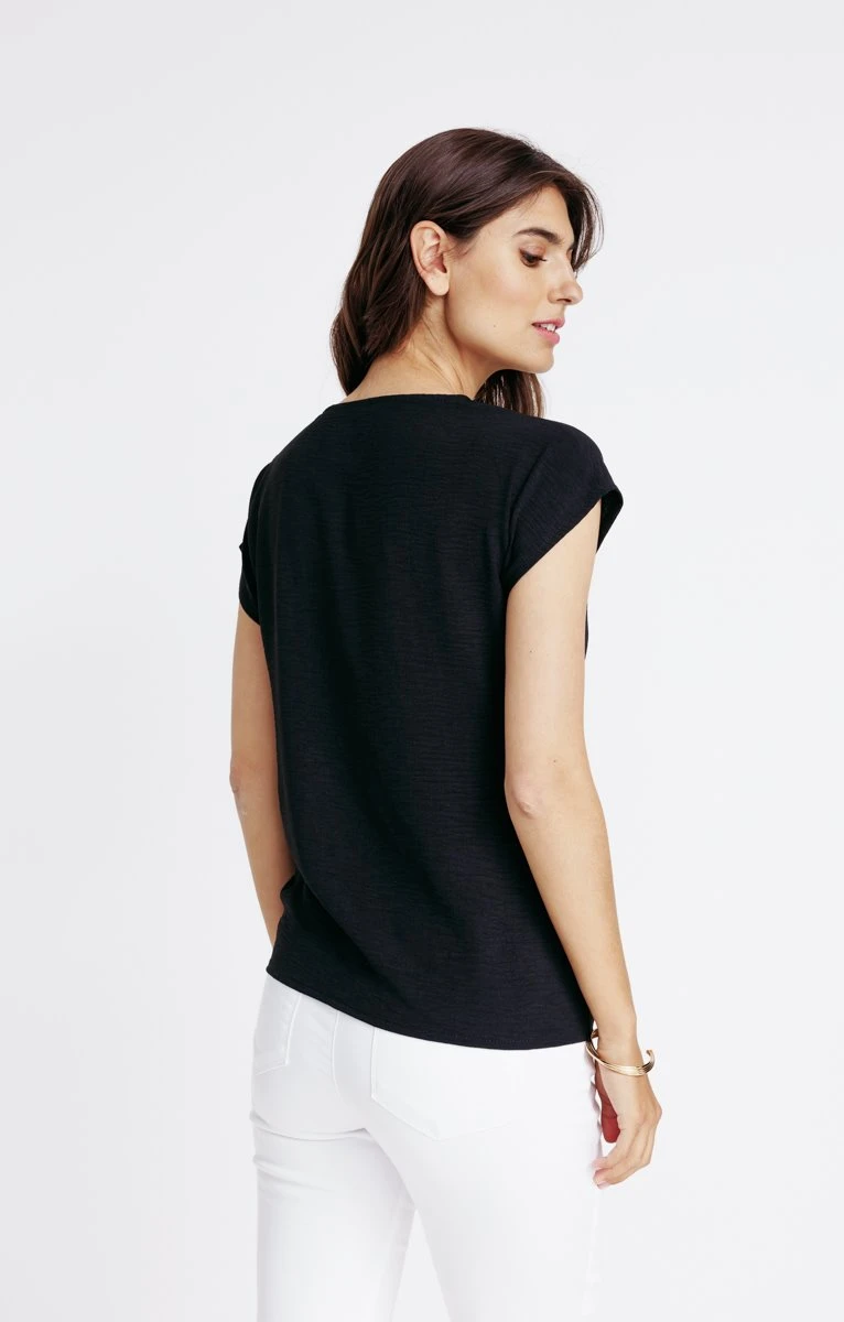 Chemisier noué uni avec col en V. Coupe droite. Manches courtes forme kimono. Col en V. Boutons et pans à nouer à l’avant. Une poche plaquée sur un côté de la poitrine. Chemisier confectionné en maille flammée unie. Boutons contrastants. Coutures discrètes ton sur ton. Ce haut intemporel accompagne parfaitement un bas uni ou à motifs. Notre mannequin Laura mesure 1m78 et porte un chemisier taille 1.